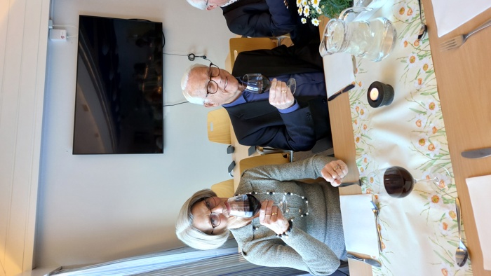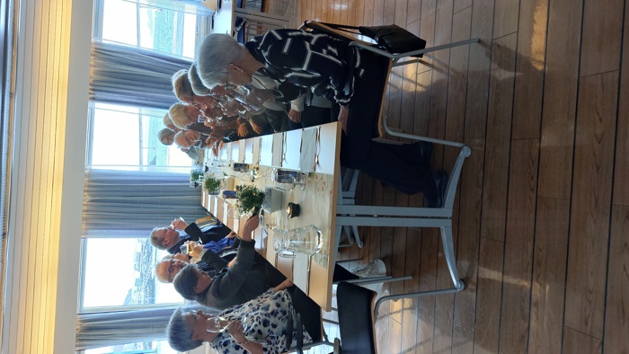 Så dermed var vi 14 feststemte deltakere som kunne nyte gryterett laget av SKYS/Kjøkken med dertil hørende god drikke, etter først å ha blitt ønsket velkommen og fått en velkomstdrink i befalssalongen.