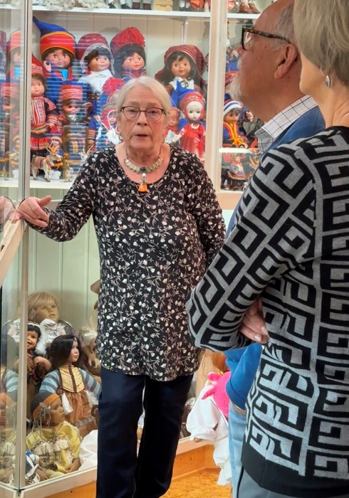 Innehaver Svanhild Reinholdsen orienterte, hadde også laget noen av dukkene og kostymene sjøl, og viste oss rundt i museet og forklarte det vi så.