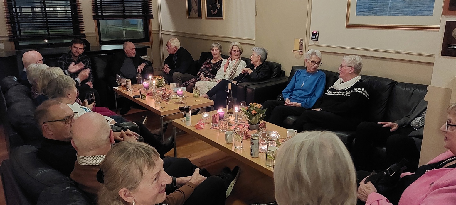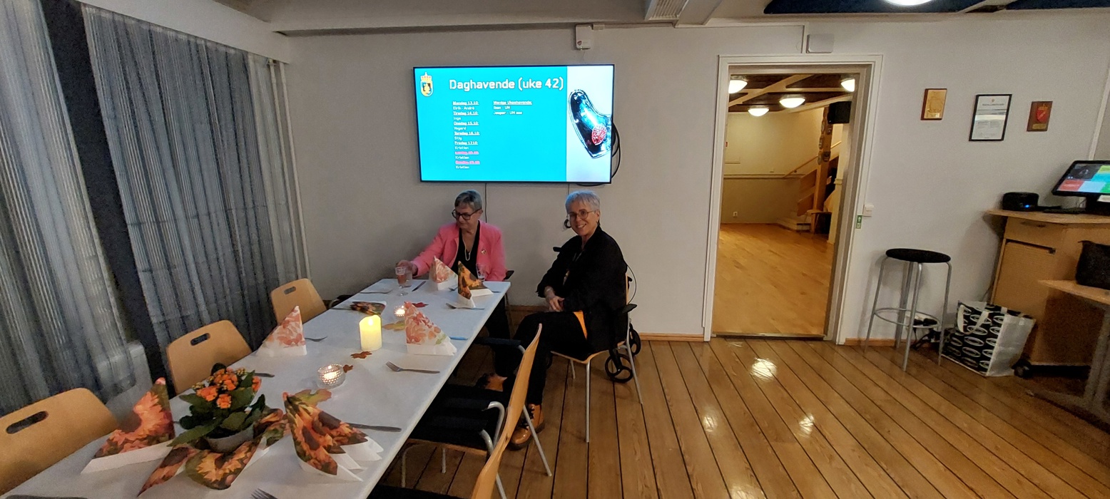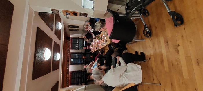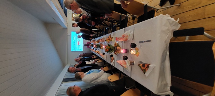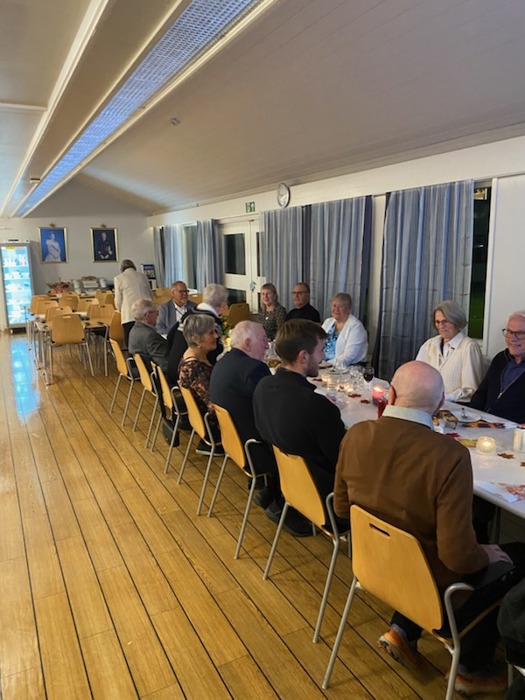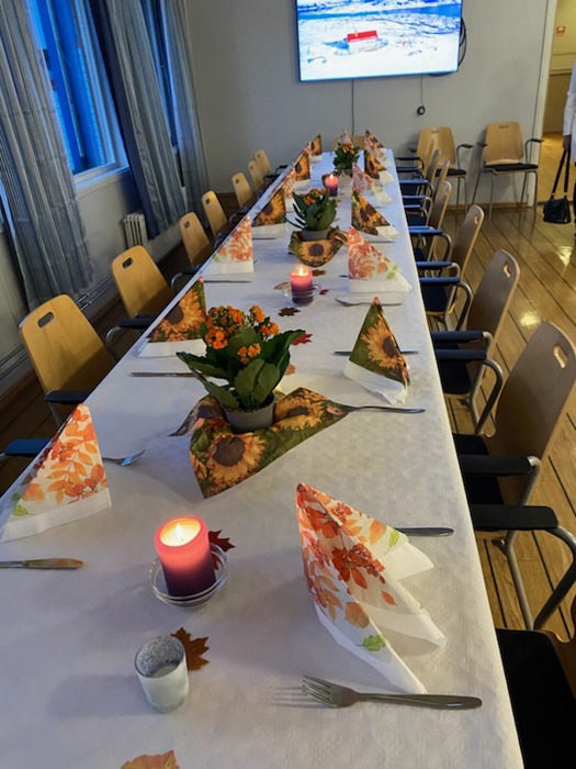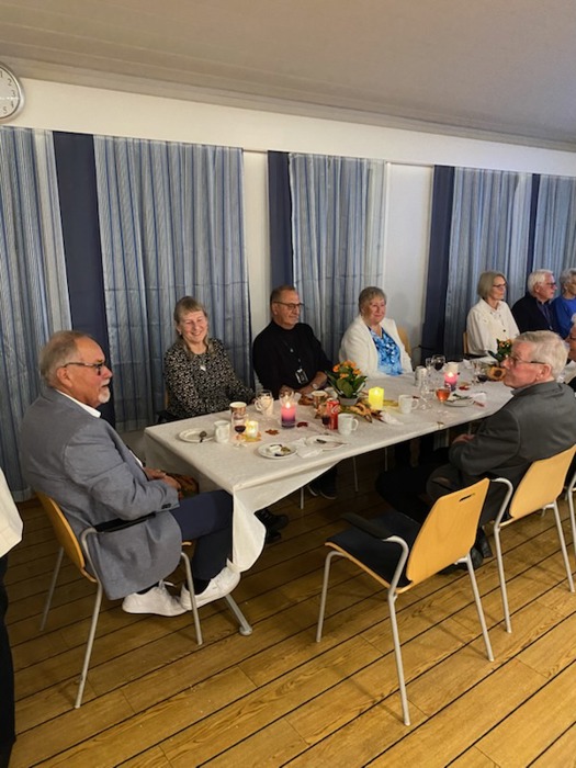 Til tross for øsende regnvær møtte 20 feststemte deltakere (hvorav ett (voksent) barnebarn og 3 nyinnmeldte) til velkomstdrink, gryterett (finnbiff m/tilbehør og dessert i form av ei deilig sjokoladekake med pynt) og god drikke, samt hyggelig prat ved et flott pyntet langbord. (2 av deltakerne møtte etter bespisningen).