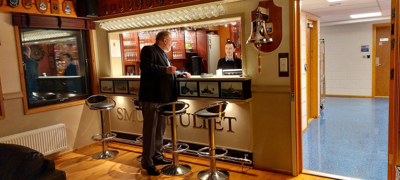 Etter bespisning, og rydding i messa, trakk vi ut i befalsalongen hvor det var åpen bar, fin musikk og sosialt samvær hvor praten gikk livlig rundt bordene.